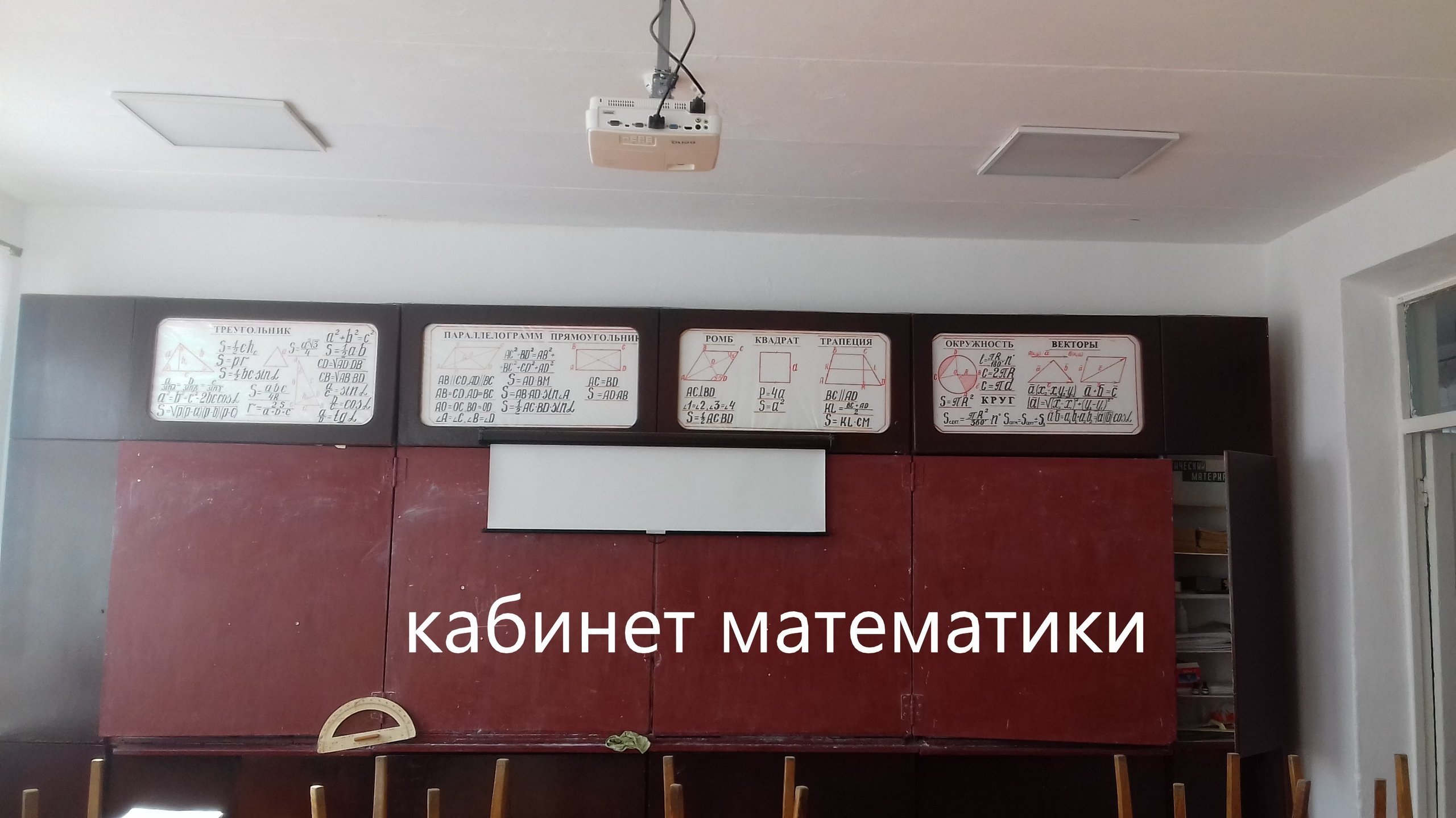 Кабинет математики № 217: | учительский стол - 1, учительский стул - 1, столы школьные - 12, стулья - 23, доска – 1 шт., стенка мебельная – 1, математические приборы стенды и плакаты, отражающие содержание рабочих учебных программ по дисциплине: «Формулы сокращенного умножения», «Таблица квадратов натуральных чисел», «Тригонометрические формулы», «Показательная функция, логарифмы и их свойства», «Свойства степени с целым показателем», «Формулы площадей геометрических фигур»; геометрические модели. |