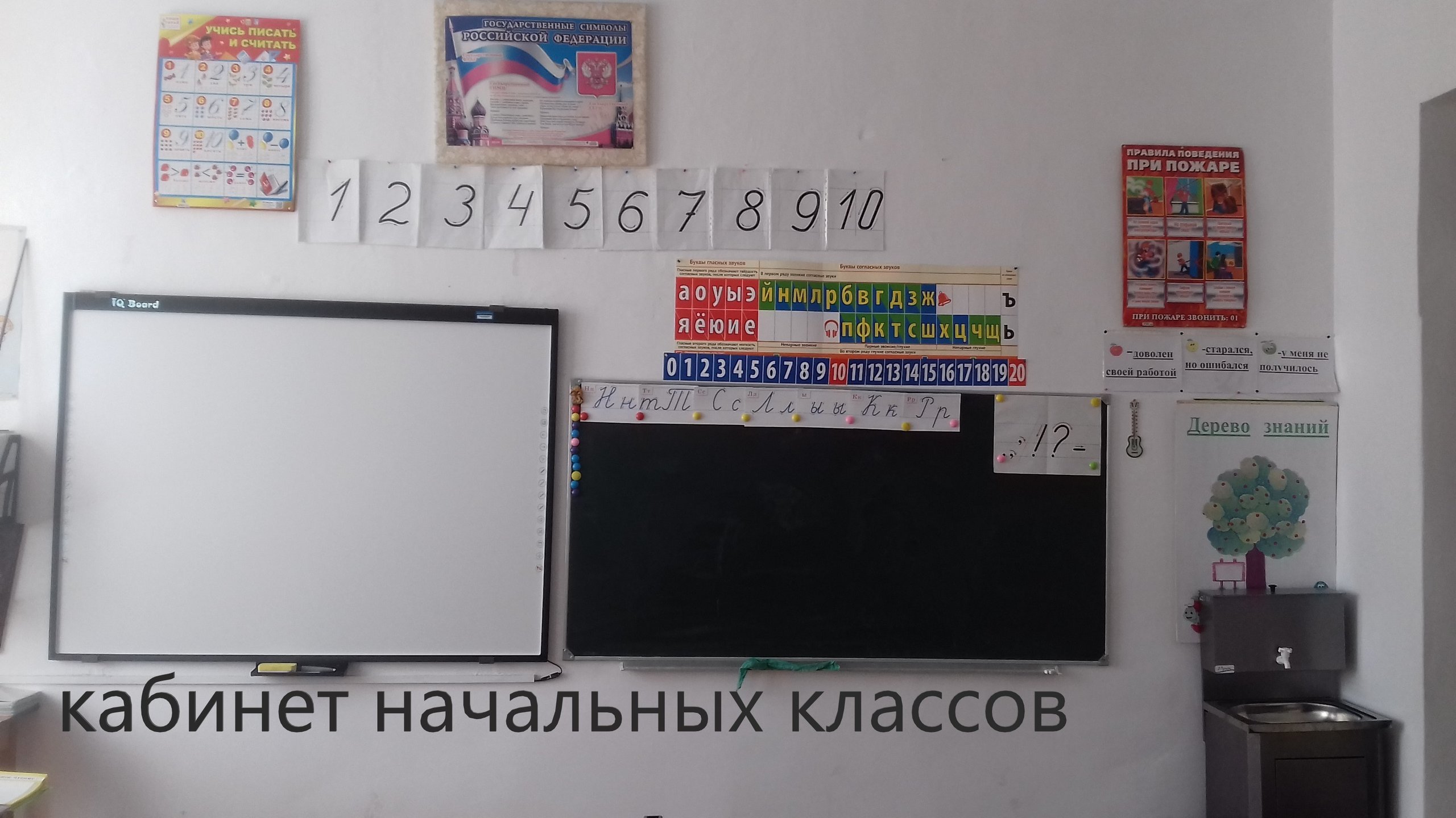 Кабинет начального обучения №103: | 10 парт, 1 учительский стол, 1 учительский стул, стенка мебельная – 1 шт., доска – 1 шт., мультимедийный комплекс -1 шт стенды, плакаты, отражающие содержание рабочих учебных программ по предмету, раздаточные материалы: «Животные» , «Деревья», «Грибы», «Птицы», «Овощи», «Сказочные персонажи», «Фото поэтов», «Новогодние картинки», минералы и горные породы, гербарии растений, счетный материал. |
