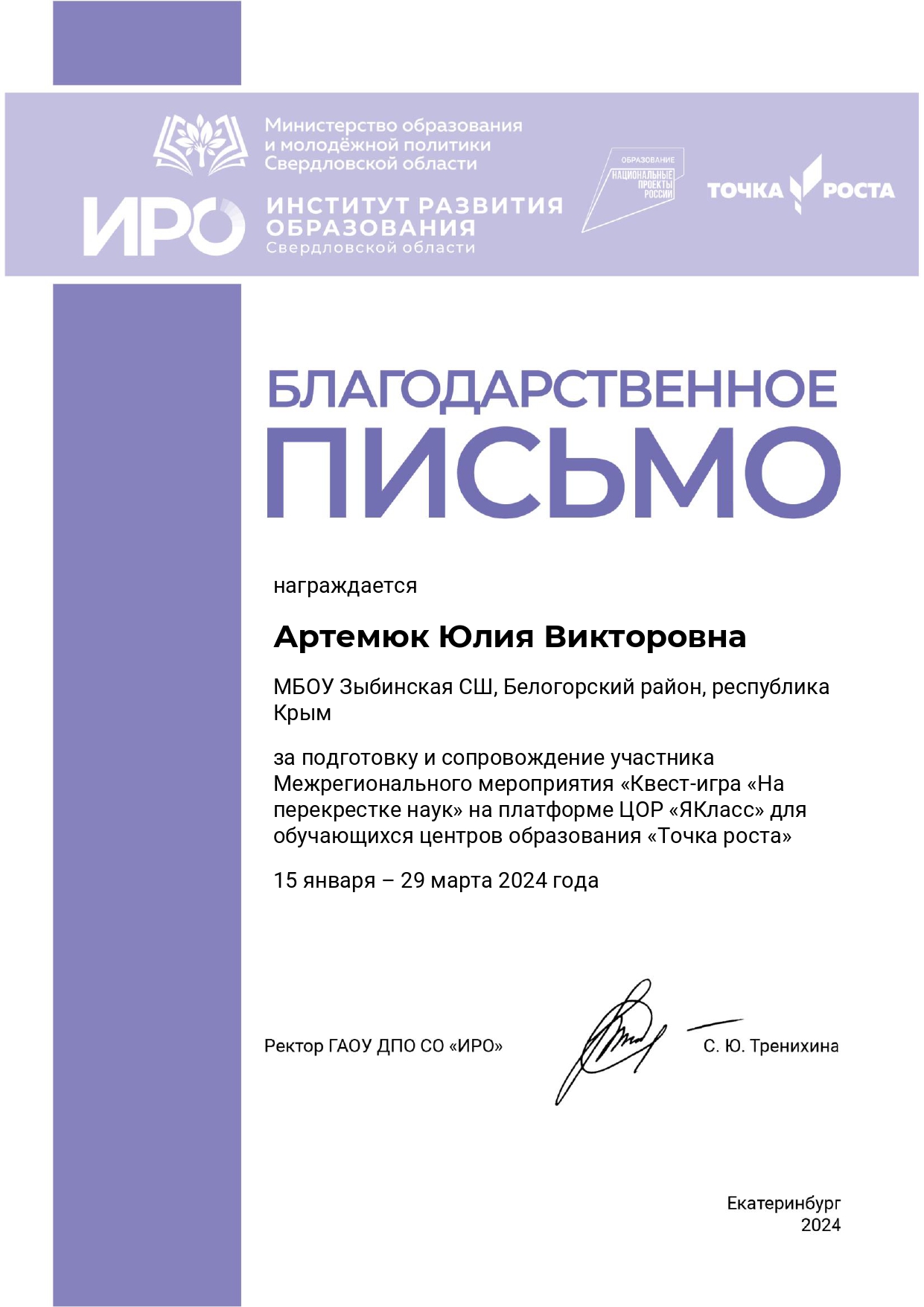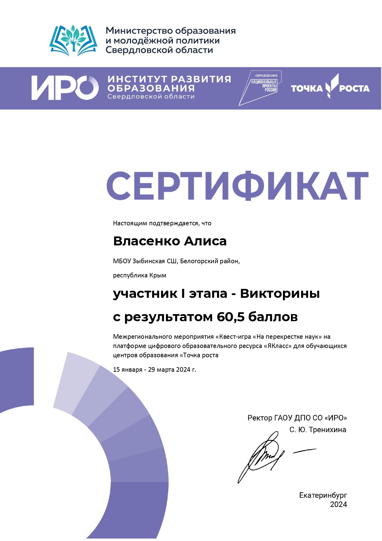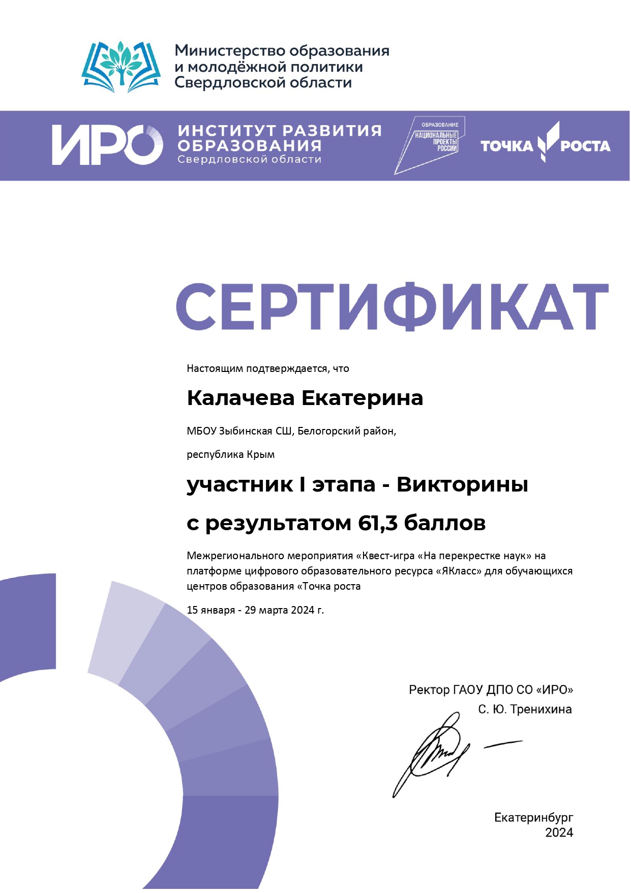 По инициативе МБОУ "Зыбинская средняя школа" Белогорского района Республики Крым в ноябре-декабре 2022 года проведена викторина "Химия в лицах" для обучающихся 7-11 классах Центра образования "Точка роста". Обучающиеся нашей школы приняли активное участие в данном мероприятии.
