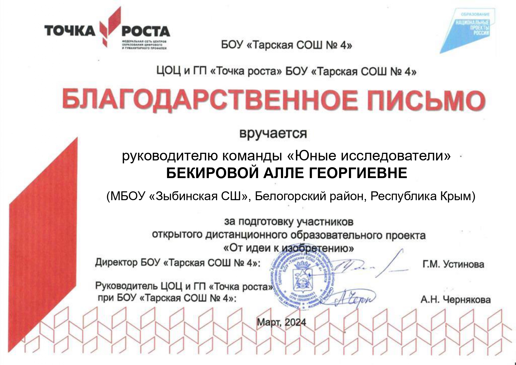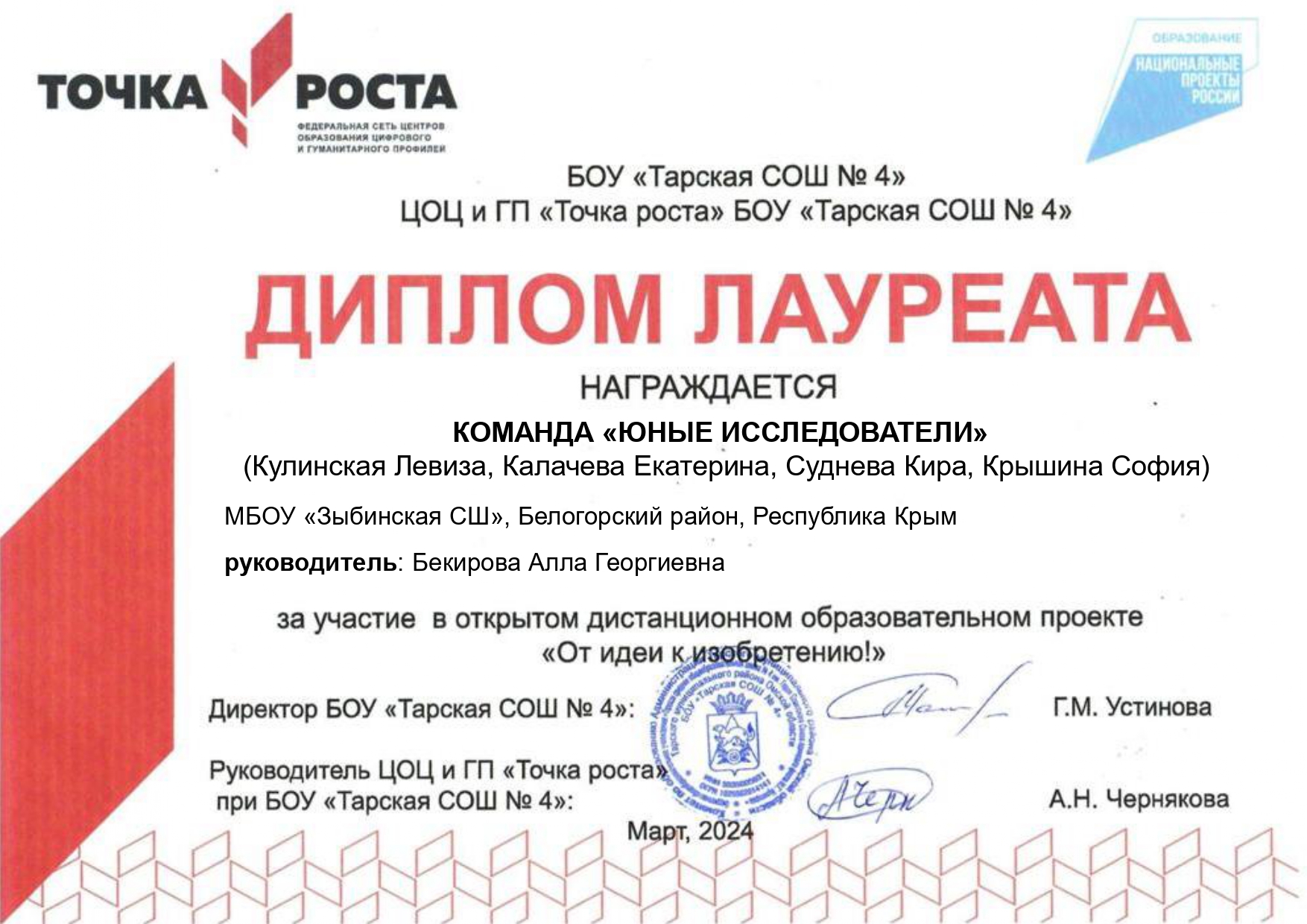 Команда нашей школы представила Республику Крым. В составе 4 обучающихся 8 класса - Крышина С., Кулинская Л., Суднева К., Калачева Е., - приняли участие в открытом дистанционном образовательном проекте "От идеи к изобретению"-2024.
