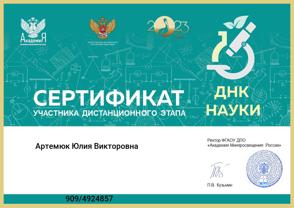 Педагоги дополнительного образования Артемюк Ю.В. и Бекирова А.Г. приняли участие в дистанционном этапе III Всероссийской профессиональной олимпиады для учителей и преподавателей естественных наук «ДНК-науки» - 2023. Химия. и III Всероссийской профессиональной олимпиады для учителей и преподавателей естественных наук «ДНК-науки» - 2023. Физика.